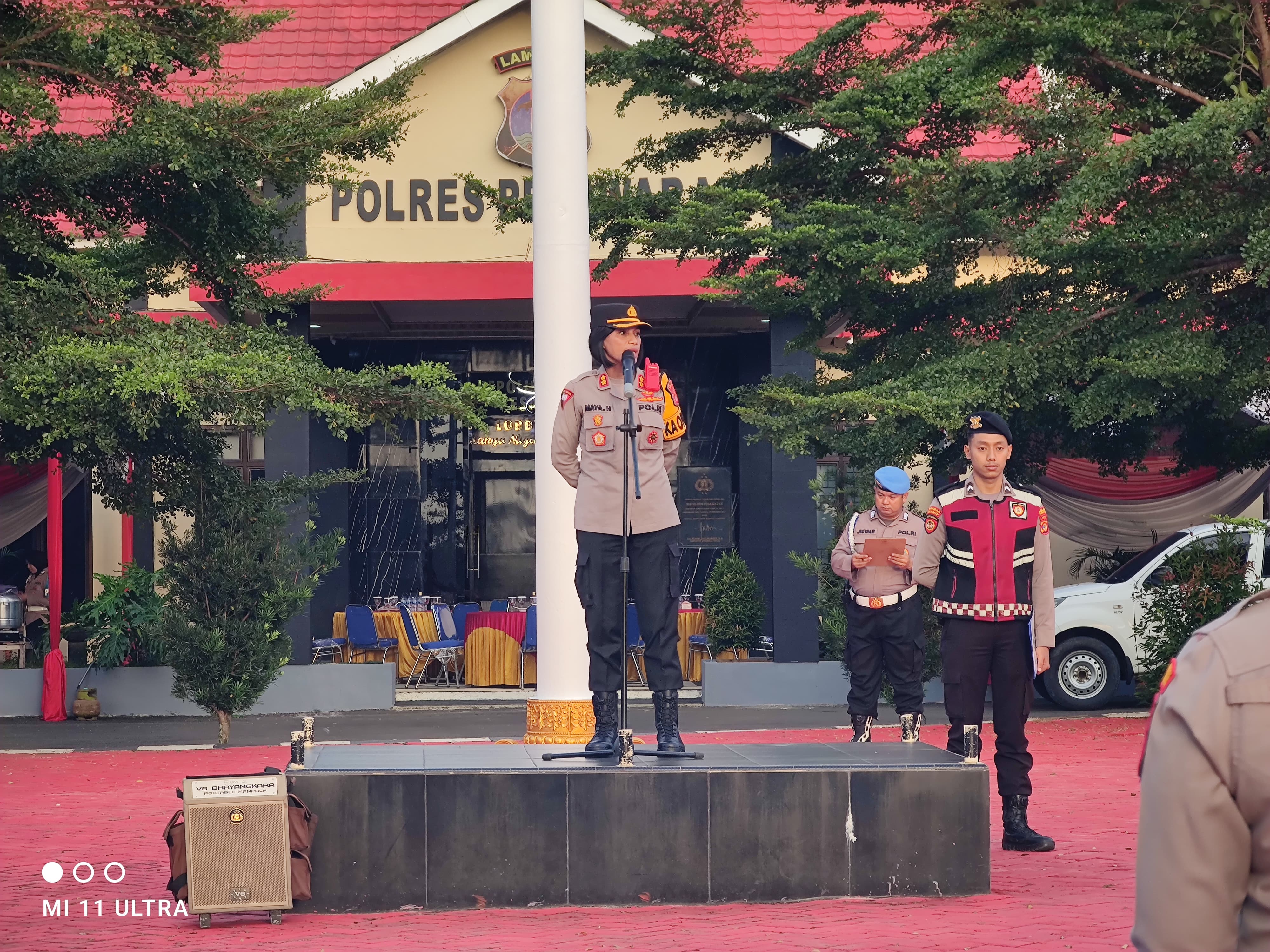 Pesawaran, 30 Maret 2025 – Menyambut Hari Raya Idul Fitri 1446 Hijriah, Kapolres Pesawaran AKBP Maya Henny Hitijahubessy, S.H., S.I.K., M.M., memimpin apel siaga malam takbir bersama TNI pada Minggu sore, 30 Maret 2025, pukul 17.00 WIB, yang berlangsung di Lapangan Apel Mapolres Pesawaran. Kegiatan ini bertujuan untuk memastikan keamanan dan ketertiban selama malam takbir serta mempererat hubungan antara TNI dan Polri dalam menghadapi perayaan Idul Fitri yang penuh berkah.